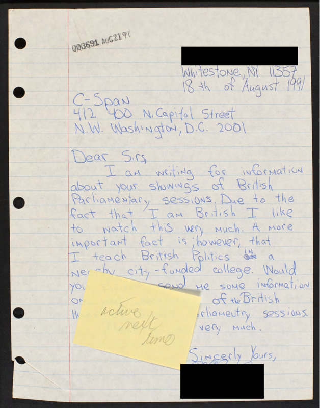 Letter to C-SPAN, 1991-08-18; 11357
