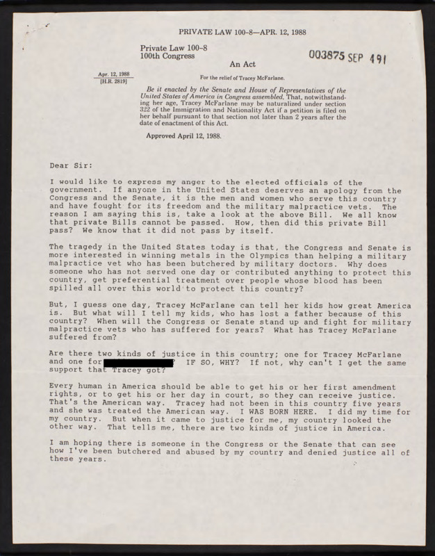 Expresses discontent with government for maltreatment of veterans/military malpractice.