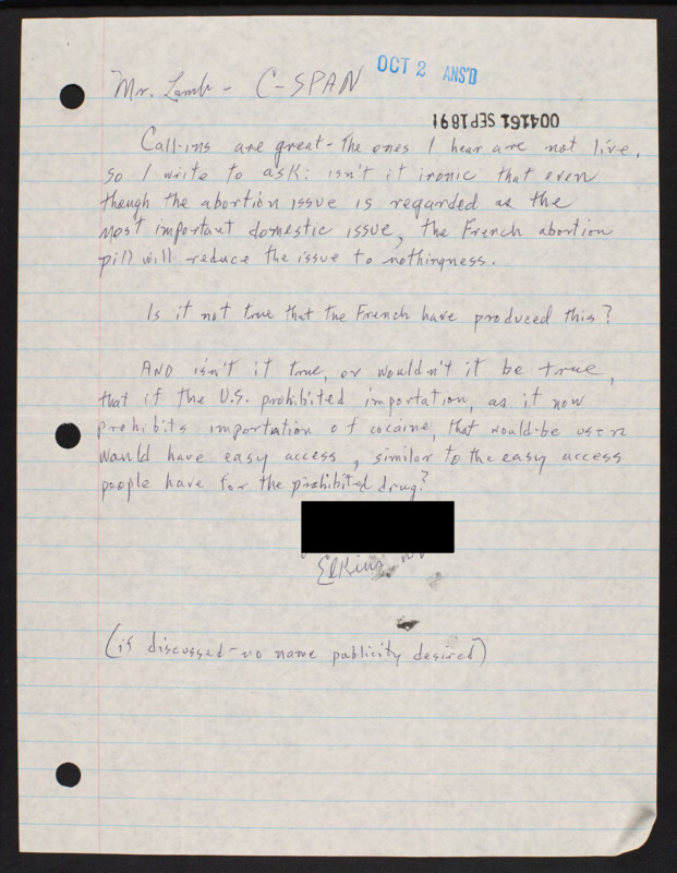Letter to C-SPAN, 1991-09-16; 26241