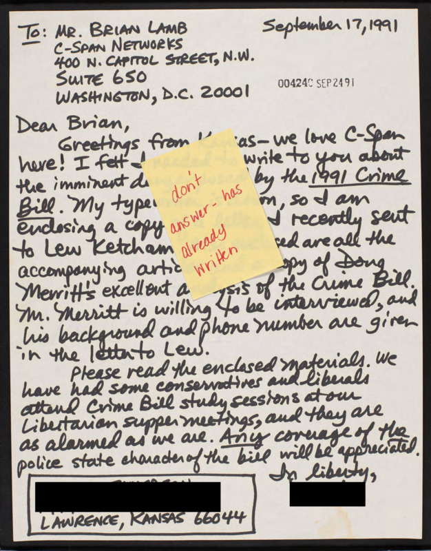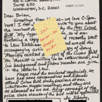 Encloses several documents higlighting benefits of Libertarian Party, critiques of the Crime Bill of 1991 as violation of the Constitution and the War on Drugs' failures, Douglas Merritt's analysis of bill, etc.