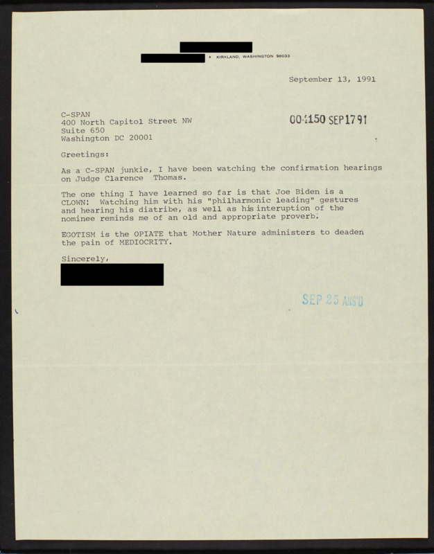 Expresses appreciation of coverage on Clarence Thomas and discontent with Joe Biden.