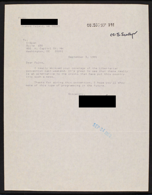 Letter to C-SPAN, 1991-09-03; 98221