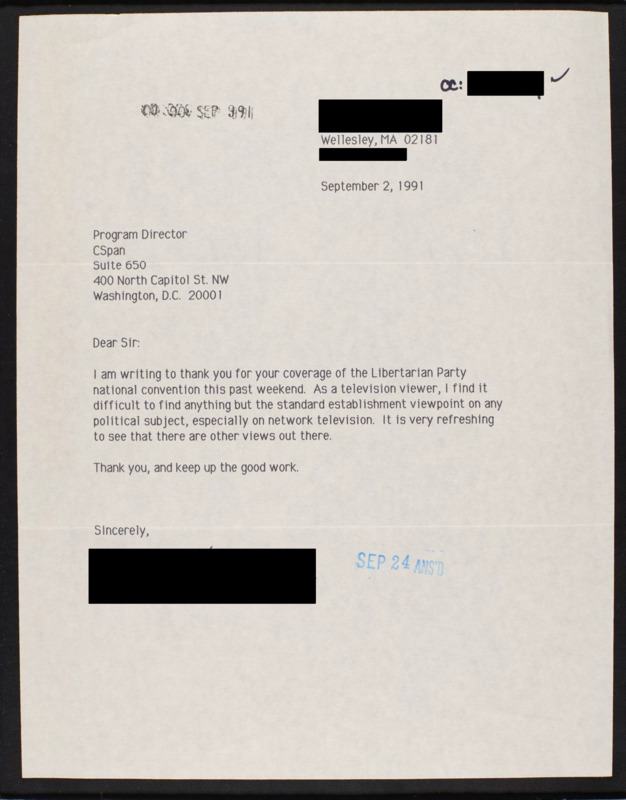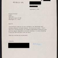 Expresses appreciation for coverage of Libertarian Party Conventions.