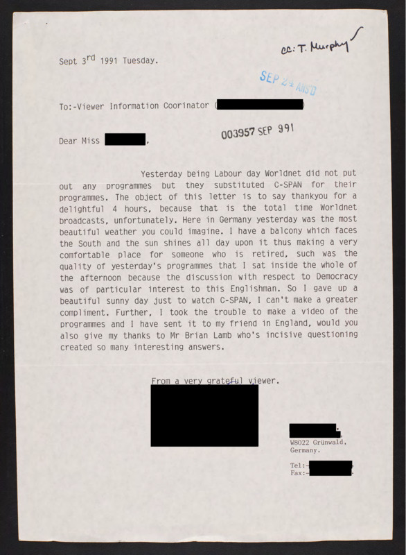 Letter to C-SPAN, 1991-09-03
