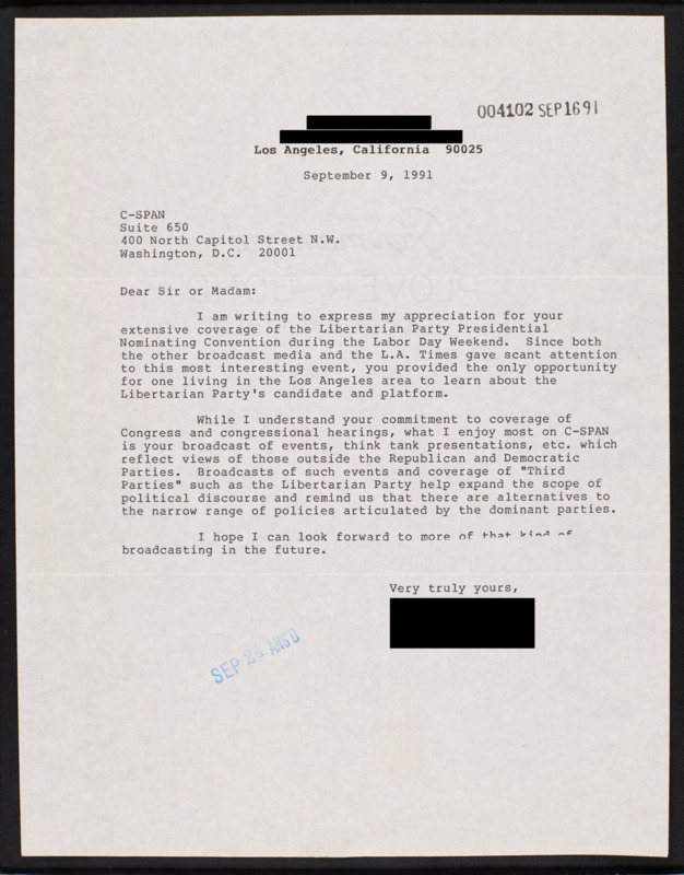 Letter to C-SPAN, 1991-09-09; 90025