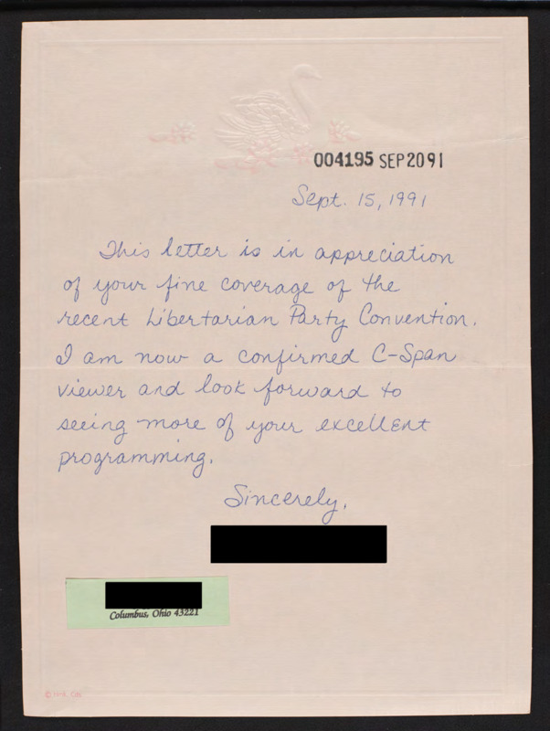 Letter to C-SPAN, 1991-09-15; 43221