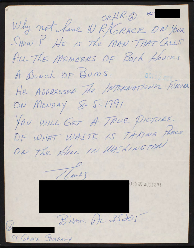 Suggests featuring W.R./H.R. Grace on program to speak about failings of Congress.