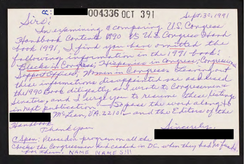 Expresses discontent with C-SPAN book on Congress for omitting African Americans, Hispanics, and women in Congress.