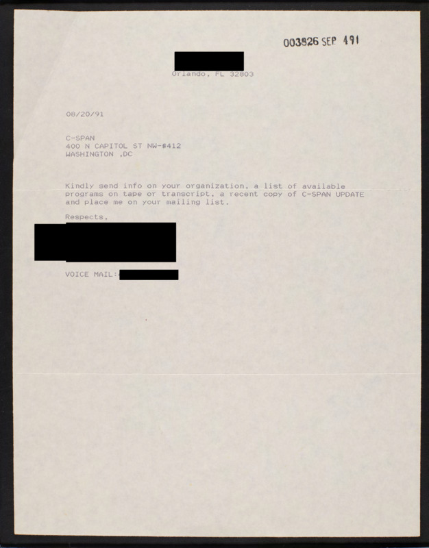 Letter to C-SPAN, 1991-08-20; 32803
