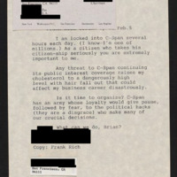 Encloses an article about threats to C-SPAN broadcasting and asks what to do to stop it.