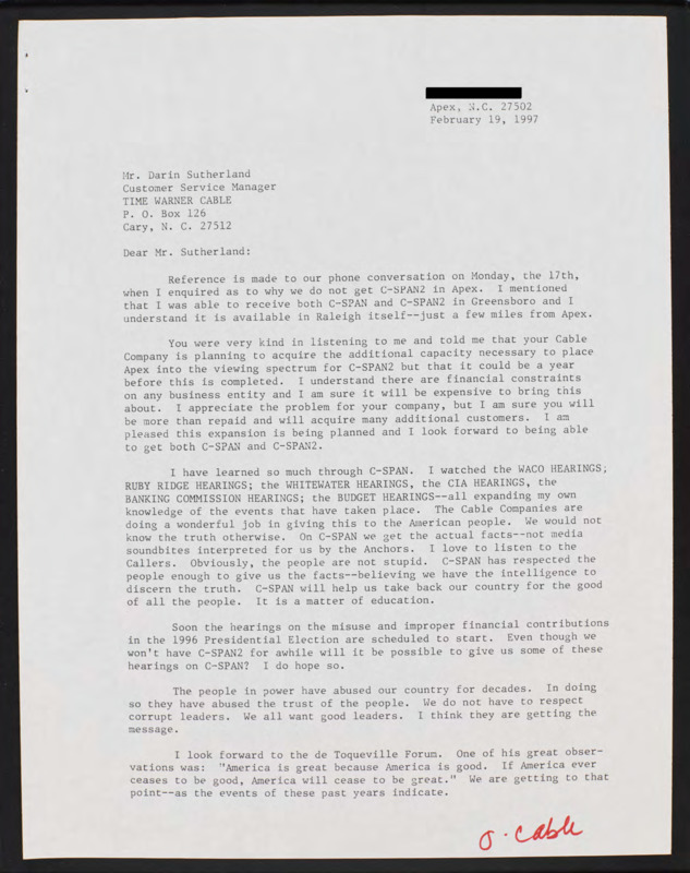 Letter to C-SPAN, 1997-02-19; 27502
