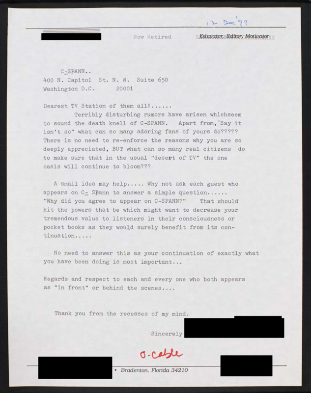 Letter to C-SPAN, 1997-12-12; 34210