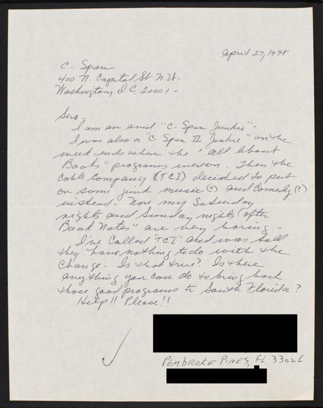 Reports that their local cable company cut C-SPAN 2 on weekend nights and asks what they can do.