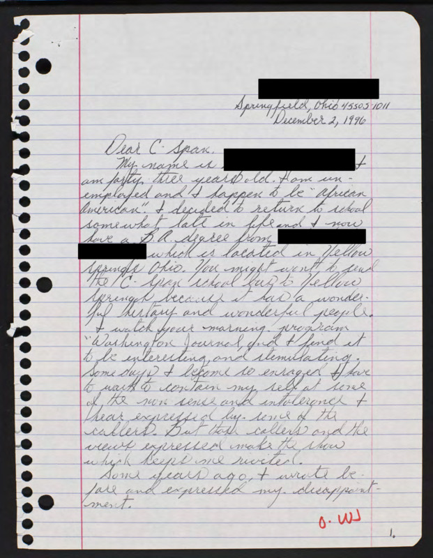Explains their personal history, praises C-SPAN, thanks them for adding more diverse guests, and suggests a program featuring ordinary citizens.