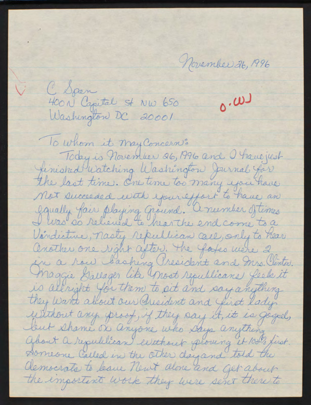 Letter to C-SPAN, 1996-11-26