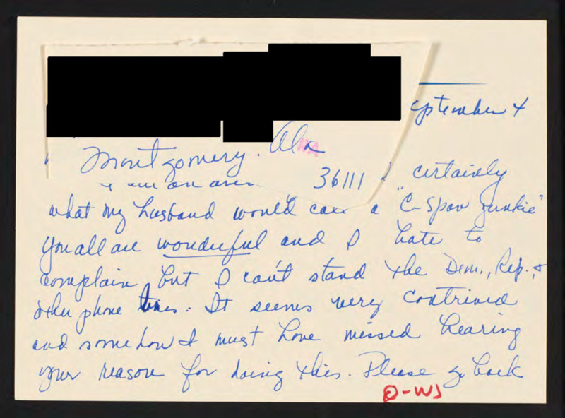 Reports that they don't like the divided phone lines, praises C-SPAN, and asks if they have considered radio broadcasting.