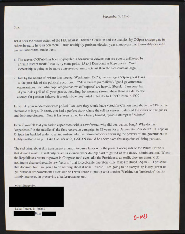 Feels that C-SPAN's division of call-in lines is partisan and is an attempt to favor the Clintons.