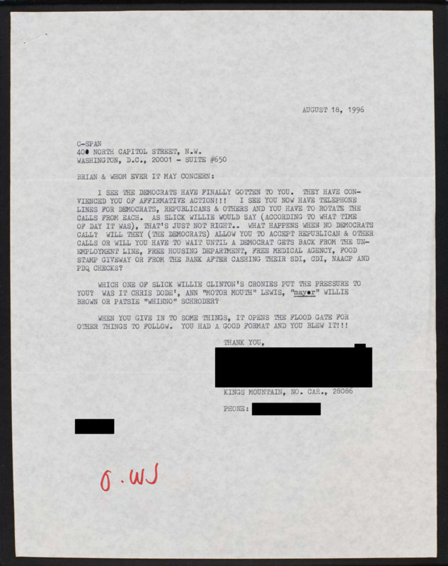 Criticizes C-SPAN's new call-in system and Bill Clinton.