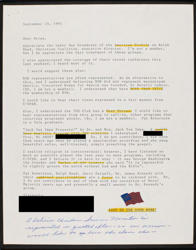 Requests the network have guests from "Concerned Women for America" and the 700 club for a call-in show. Believes Christianity should be used in politics and would like to see a program with the Christian Science Monitor.