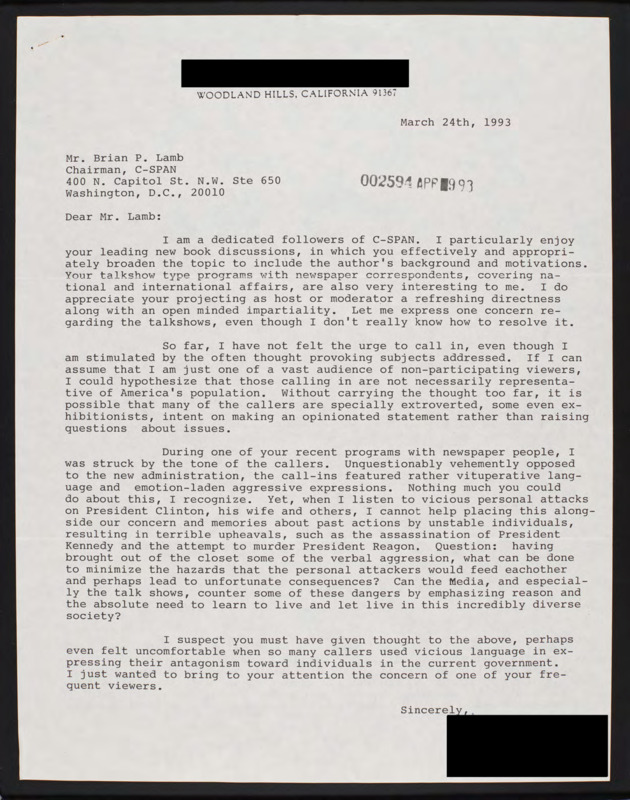 Expresses appreciation for Booknotes, but believes the call-in demographic is not representative of the American population because of their vehement hatred of Clinton; expresses concern about the vitriolic language used.