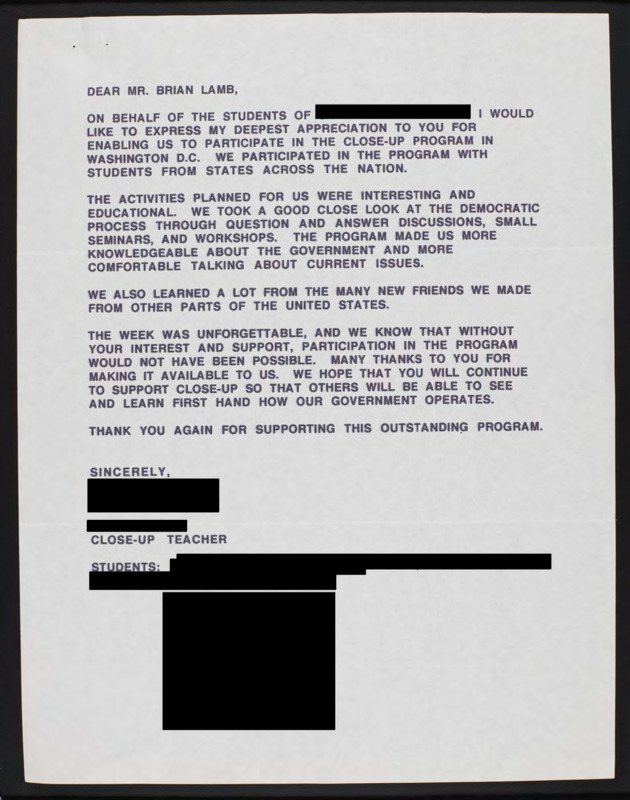 Express appreciation for Brian Lamb's involvement with Close Up program.