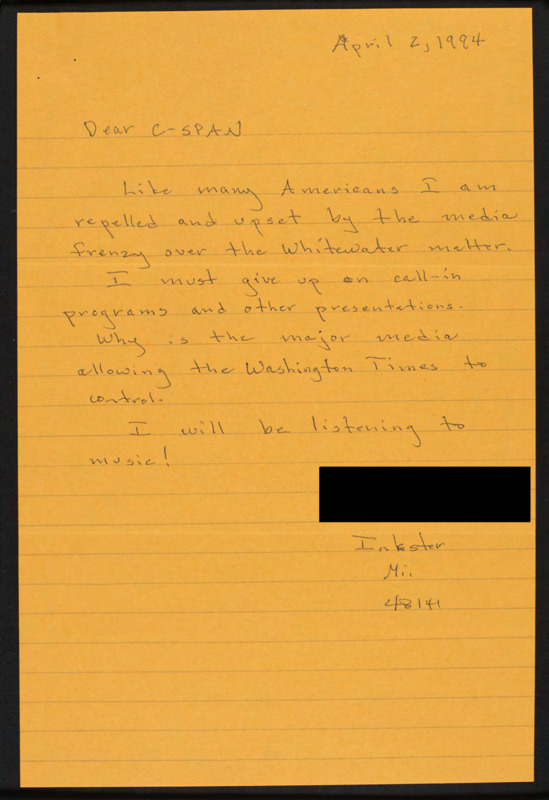 Expresses discontent with media's ad nauseum coverage of Whitewater.