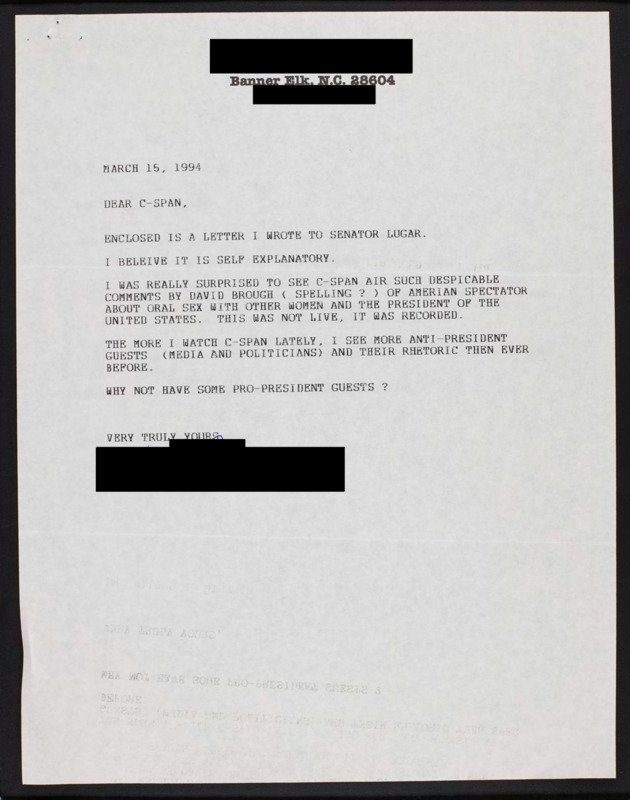 Attaches letter to his senator, Richard Lugar, criticizing him for not defending Clinton after scandalous remarks made by another guest.