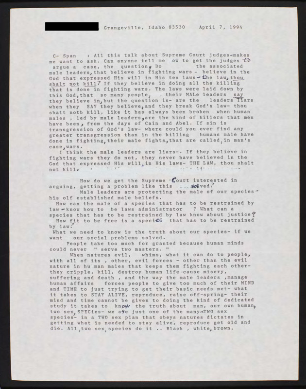 Criticizes male leaders for being too warlike and not trusting in the God they claim to believe in, for not following Jesus' word, goes through the Ten Commandments and says what they're doing wrong, especially holds the Supreme Court in contempt of this.