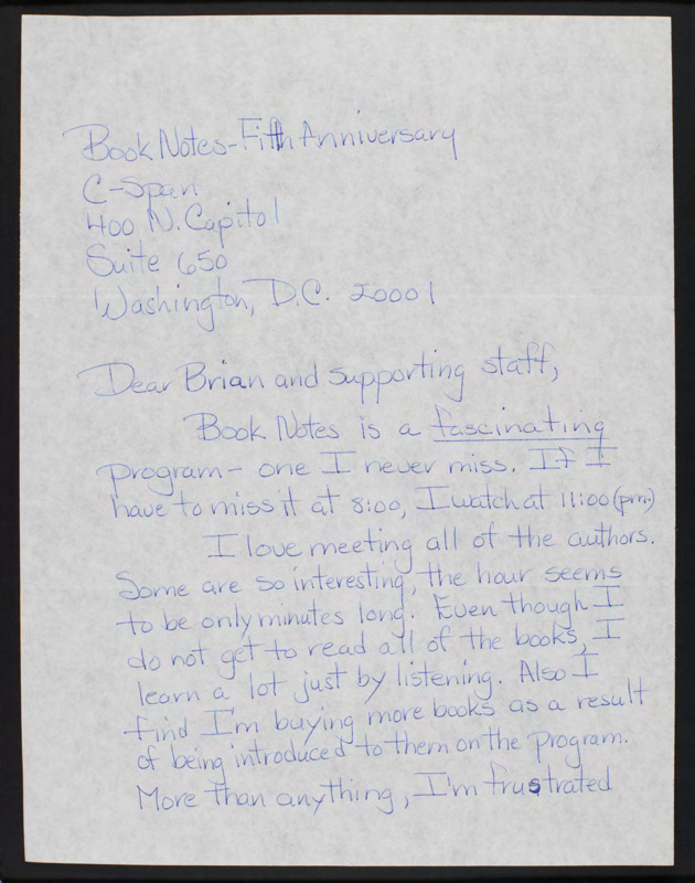 Expresses appreciation for Booknotes, for the authors that are on the show, and for Brian Lamb.