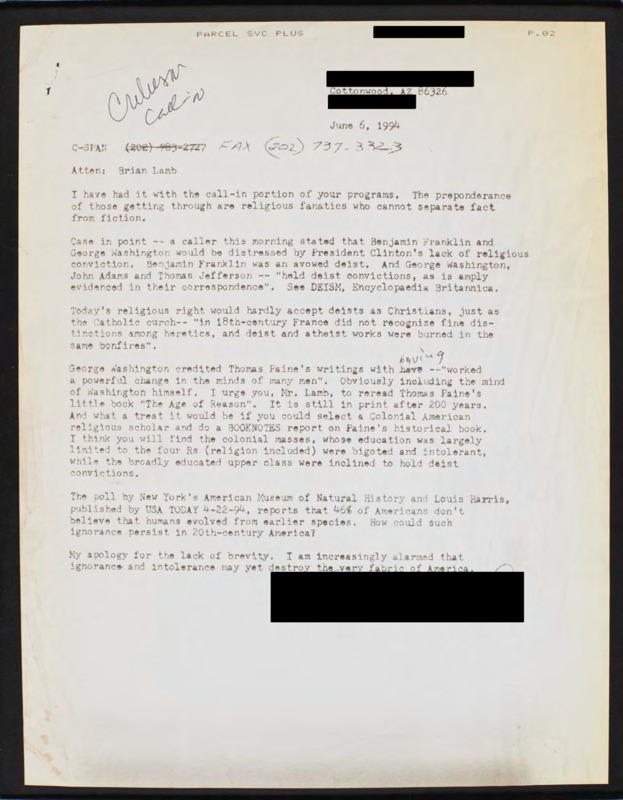 Expresses discontent with preponderance of religious-right callers on call-in shows, explains history of Founding Fathers' religious beliefs, urges Brian Lamb to read Thomas Paine.