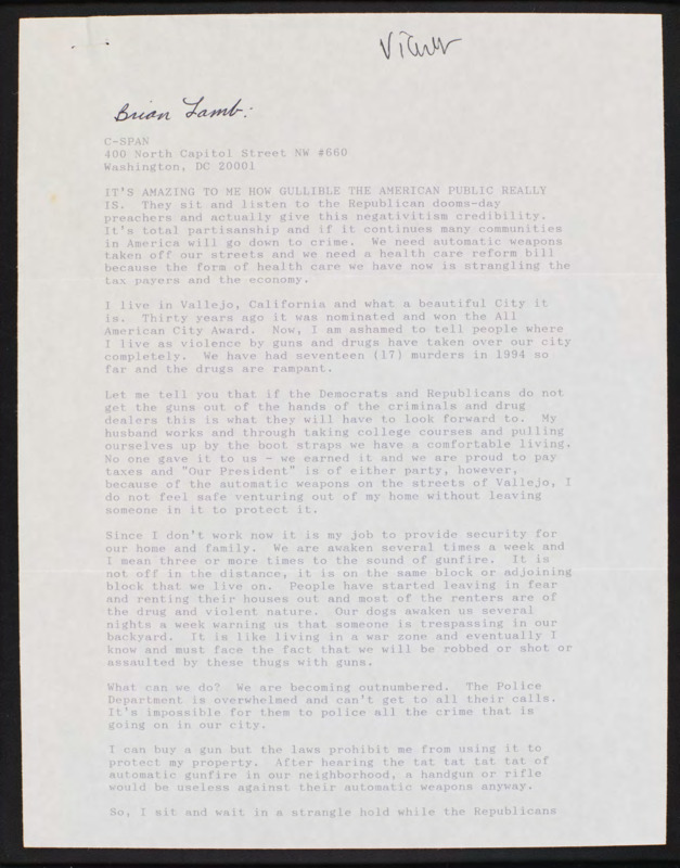 Expresses discontent with Republicans for not banning assault weapons, urges gun reform.