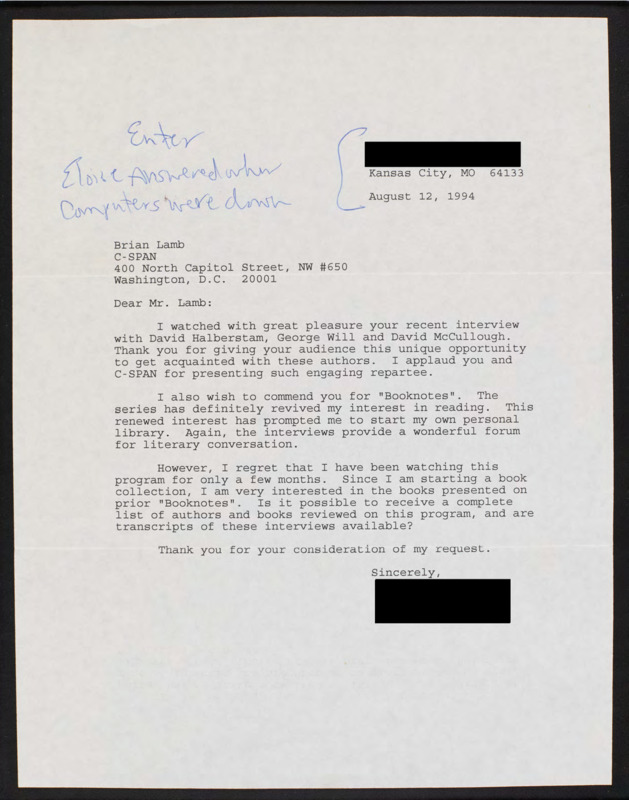 Letter to C-SPAN, 1994-08-12; 64133