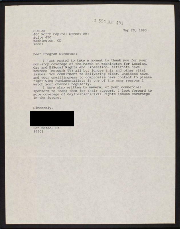Letter to C-SPAN, 1993-05-29; 94403