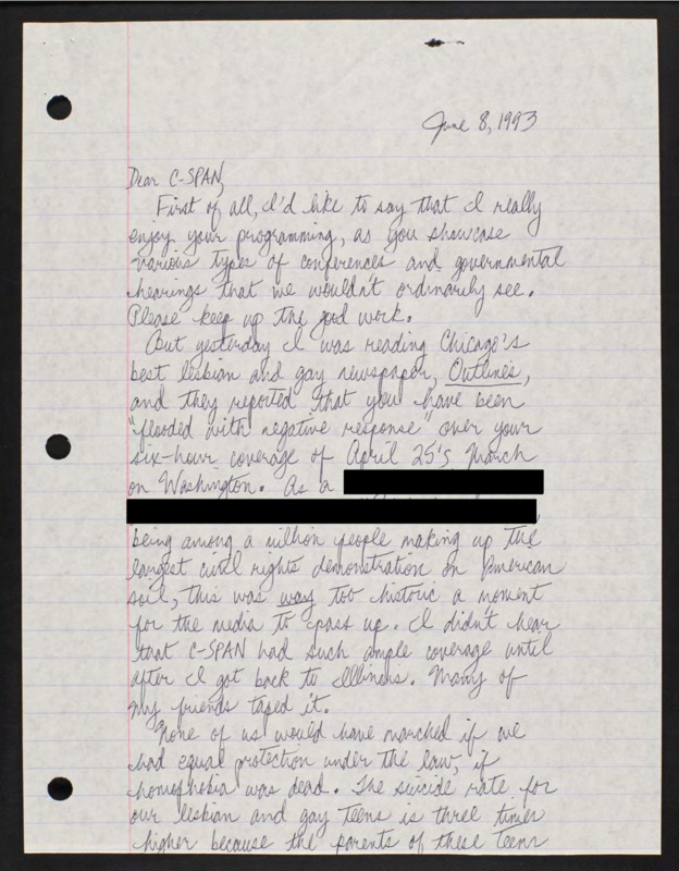 Expresses appreciation and solidarity with C-SPAN for covering the March on Washington for Lesbian, Gay, and Bi Equal Rights., discusses its significance to civil rights history.