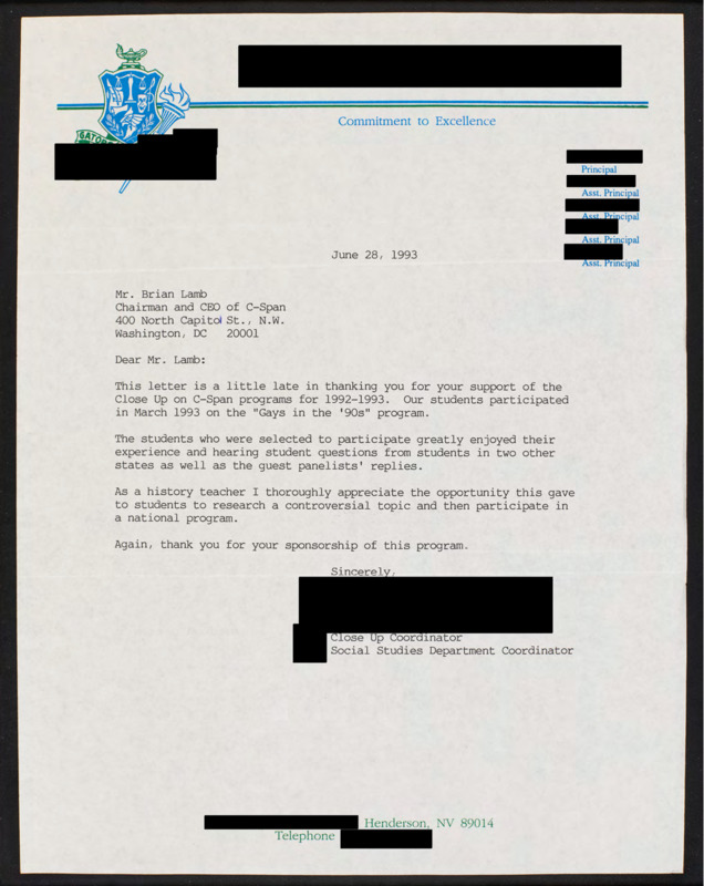 Thanks Brian Lamb for supporting the Close-Up Foundation and allowing students to participate in the "Gays in the '90s" program.