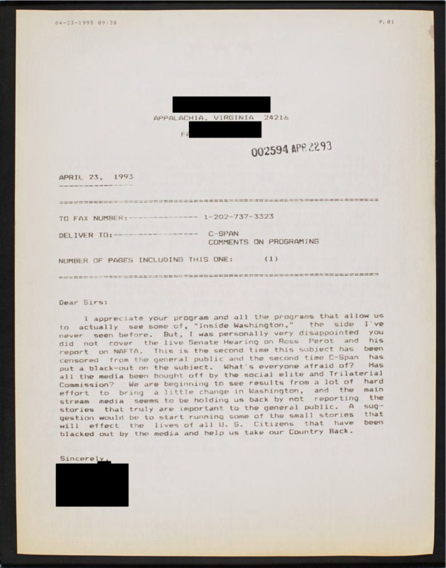 Expresses feeling disappointed in C-sPAN not airing Ross Perot's report on NAFTA. Asks why the topic is being censored by the media.