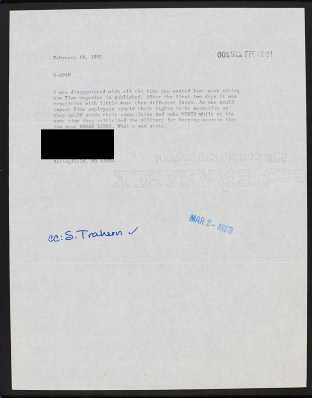 Complains about TIME magazine choosing to be secretive after TIME criticized the military for being secretive.