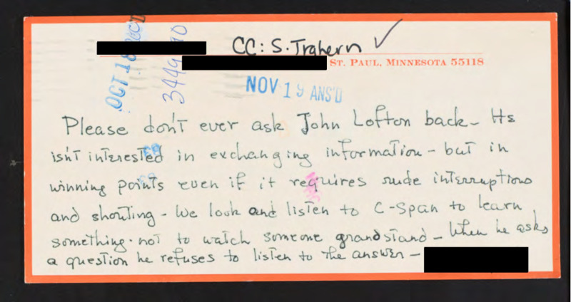 Requests C-SPAN to not invite John Lofton back on the program because of his grandstanding tendencies.