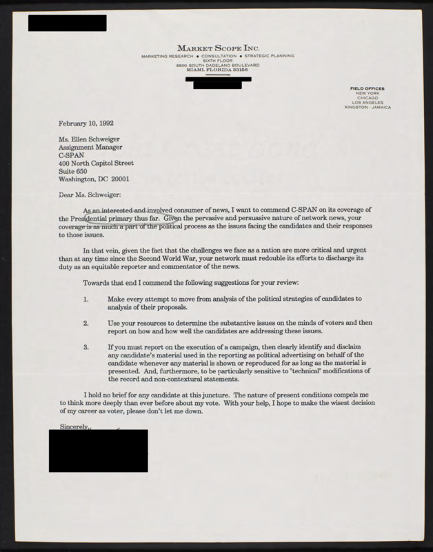 Expresses appreciation for coverage of Presidential Primaries, suggests improvement of coverage of presidential candidates.