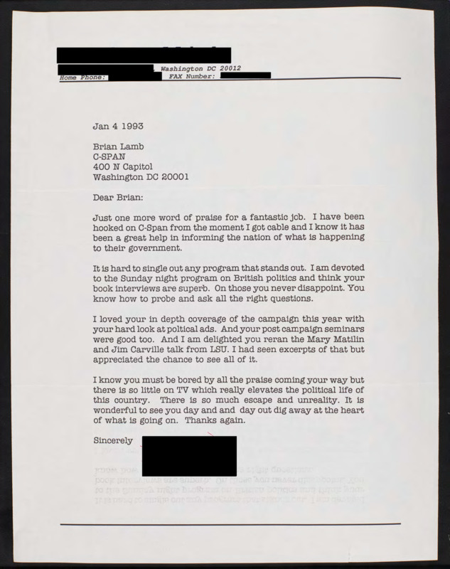 Expresses appreciation for programs, including Booknotes, British politics, and campaigns.