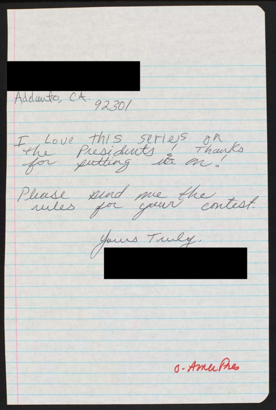 States enjoyment of the American Presidents series and requests the rules for the contest.