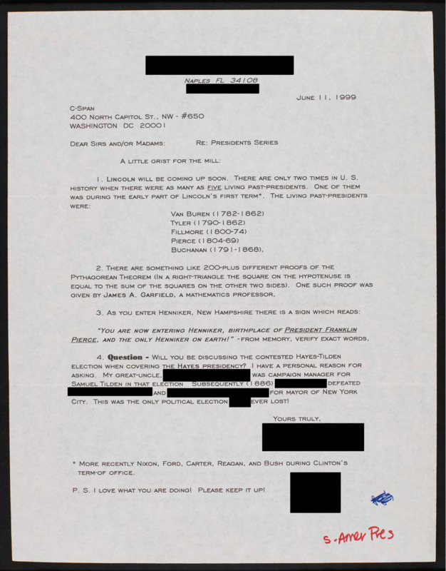 Offers facts about Abraham Lincoln, James A. Garfield, and Franklin Pierce, and asks whether the Hayes-Tilden election will be covered during the American Presidents series episode on Rutherford B. Hayes.