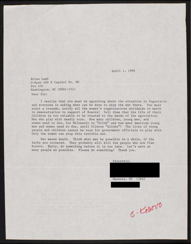 Urges Brian Lamb to ask women's organizations to demonstrate in support of Kosovo to undermine the power of "egotistical men."
