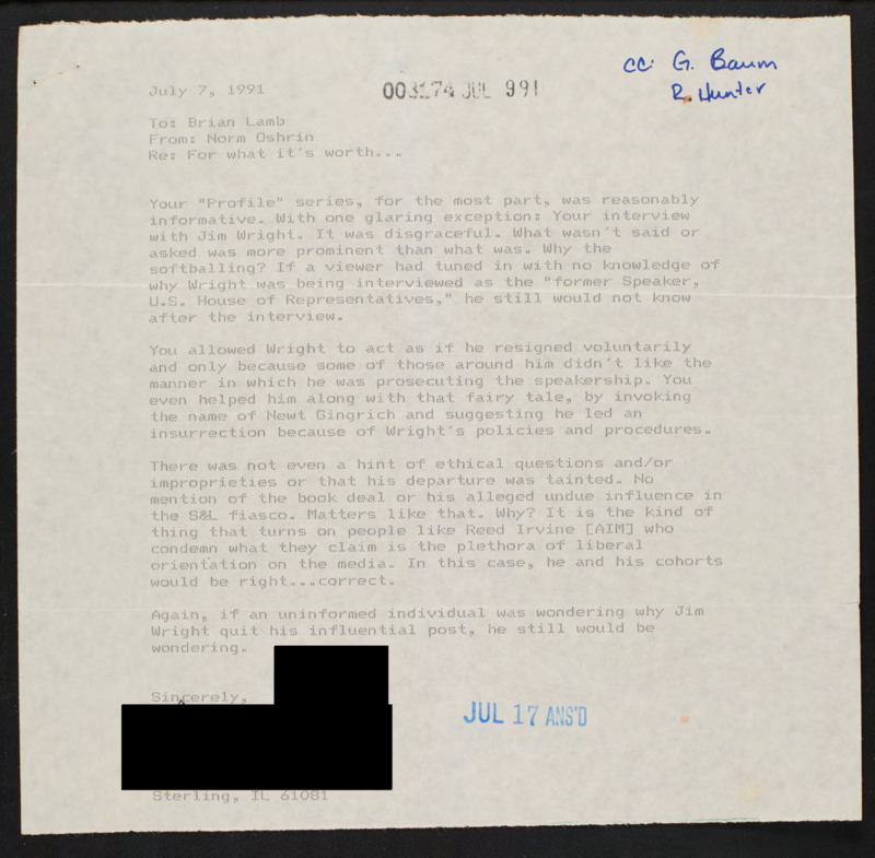 Criticizes an interview by Brian Lamb for asking easy questions.