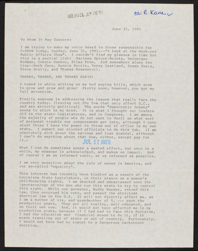 Letter to C-SPAN, 1991-06-21