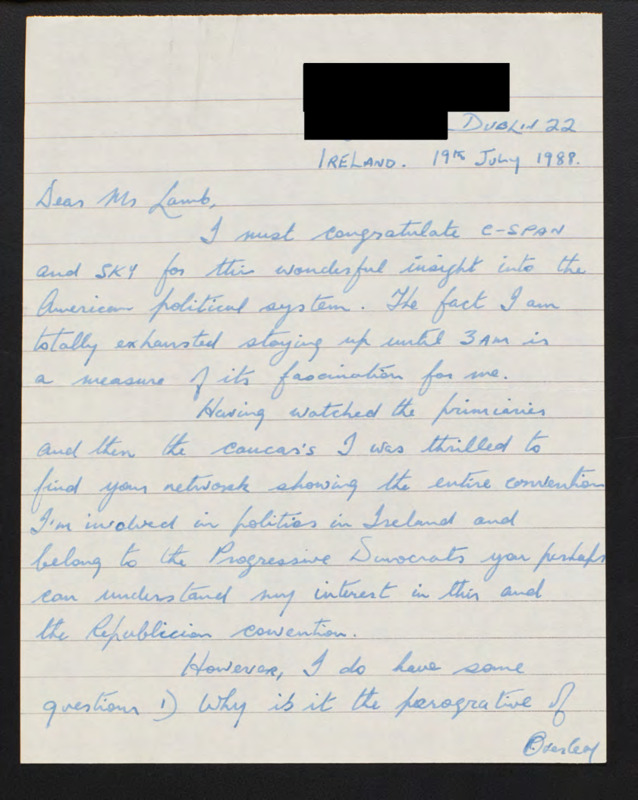 Praises C-SPAN for coverage of primaries. Raises questions about election processes.
