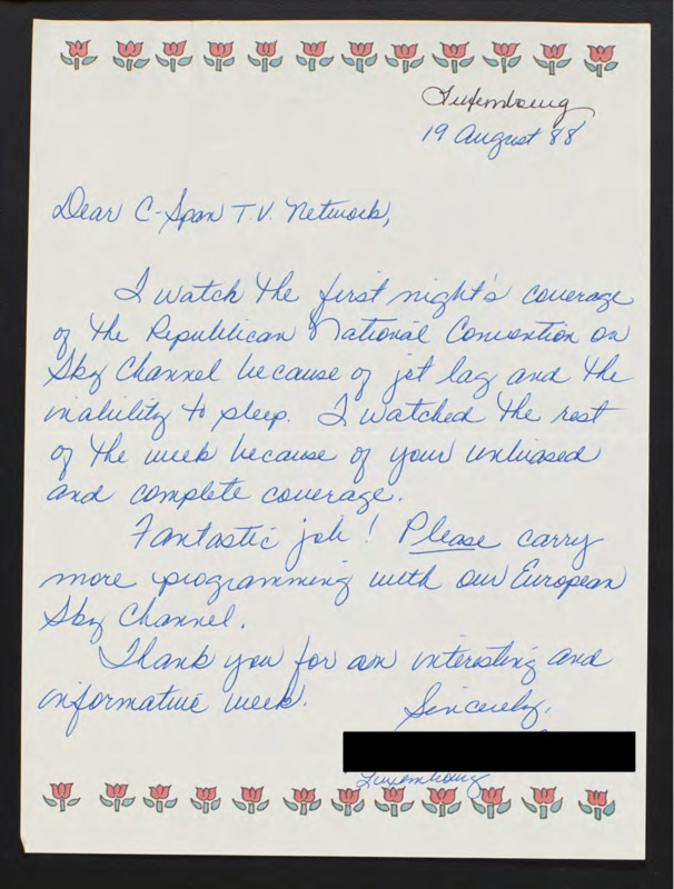 Praises C-SPAN for coverage of Republican National Conventions, asks for continued airing on European Sky channel.