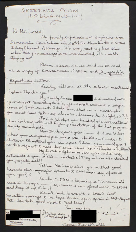 Expresses admiration for Brian Lamb, specifically his diction and articulation. Praises C-SPAN as becoming a household name throughout Europe.