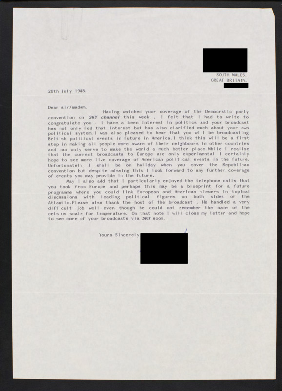 Praises C-SPAN for coverage of national Conventions and, airing British politics. Expresses enjoyment from program.