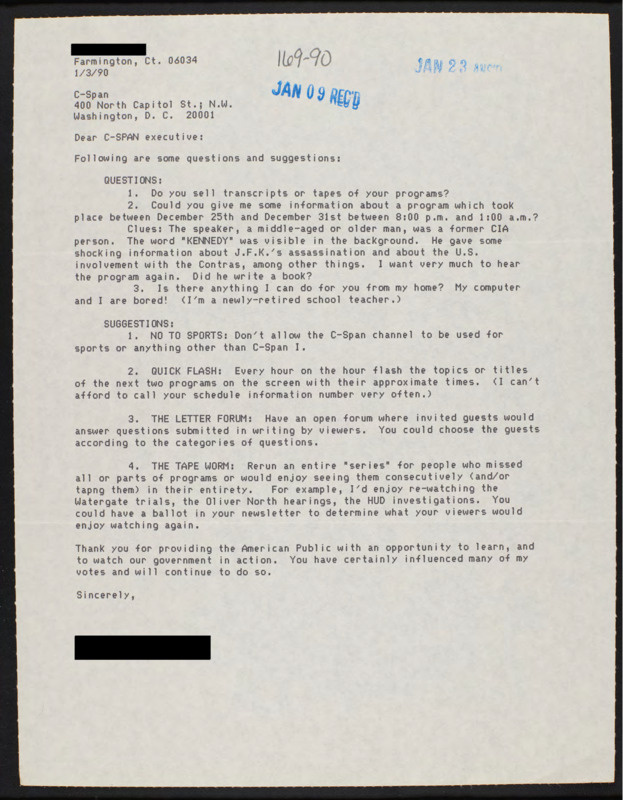 Inquires about purchasing tapes of C-SPAN programs. Offers Suggestion on the program can improve like not covering sports.